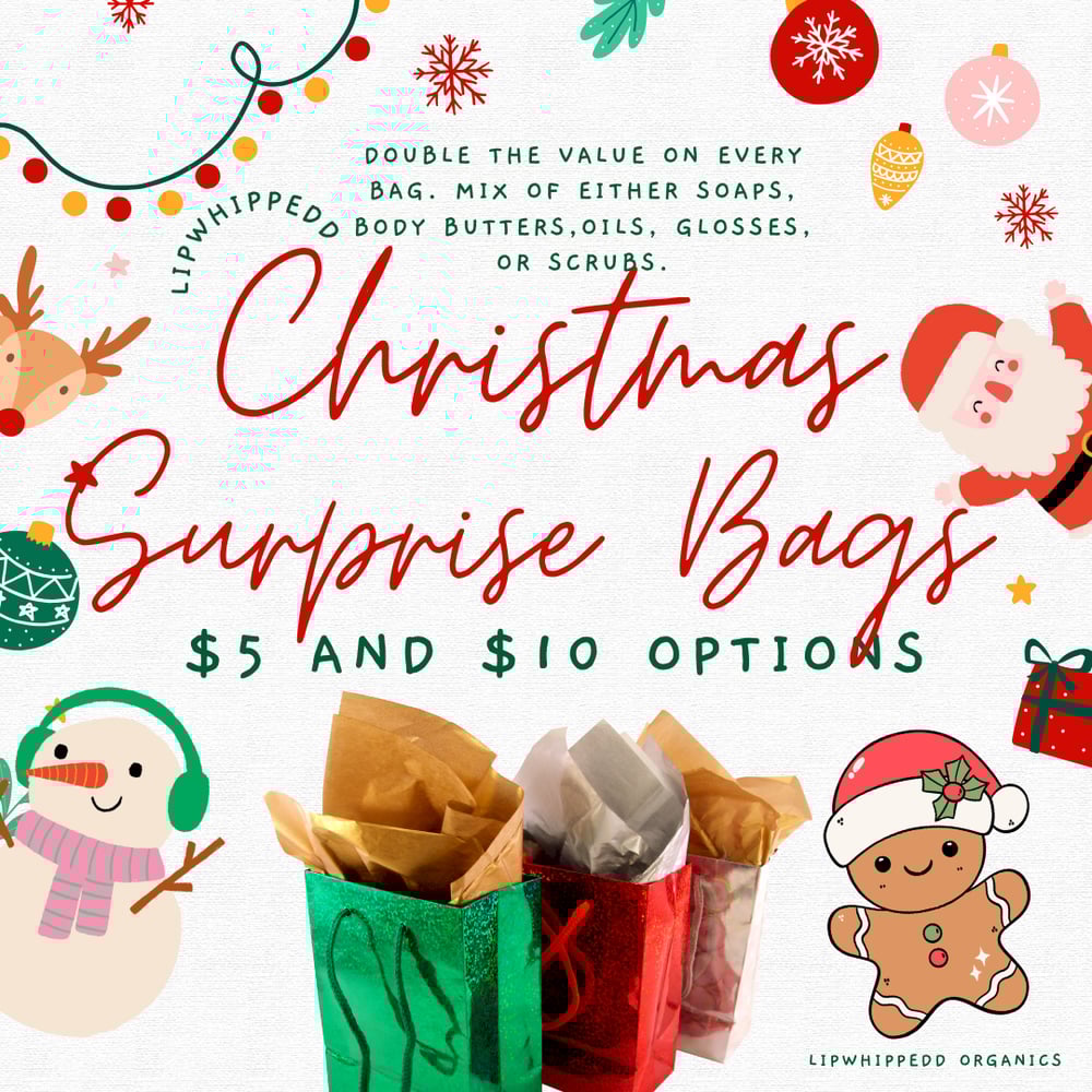 These cute Christmas Blind Bags are perfect stocking stuffers, or cute gifts for your friends, co-workers, etc. Each bag is worth double the value, and comes in a cute bag ready to be given as a gift. Each bag can have stickers, soaps, body butters, body oils, body scrubs, or even glosses. Stickers and packaging bags are all Christmas themed, and will include a cute blank card for you to fill out.