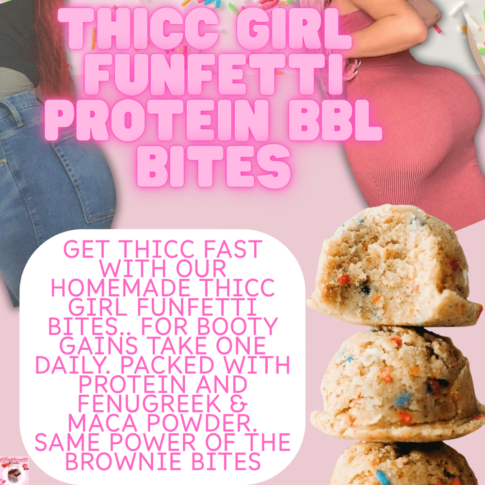 GET THICC FAST WITH OUR HOMEMADE THICC GIRL FUNFETTI BITES.. FOR BOOTY GAINS TAKE ONE DAILY. PACKED WITH PROTEIN AND FENUGREEK & MACA ROOT POWDER. SAME POWER OF THE BROWNIE BITES BUT BETTER